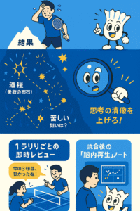 ゲーム練習中、ラリーが終わるたびに10秒だけ時間を取ります。パートナーと「今のラリー、どうしてこうなった?」と一言だけ交わすのです。「3球目のロブが甘くなったのが原因だね」「相手を前に誘い出したまでは良かった」など、簡単な言葉で構いません。この即時フィードバックの習慣が、過程を記憶する能力を劇的に向上させます。