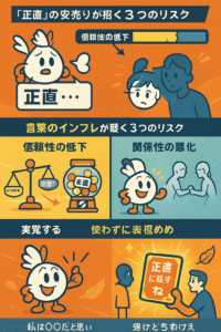 - 言葉のインフレ:本当に誠意を伝えたい場面で「正直」という言葉を使っても、その重みが失われ、相手に響かなくなります。