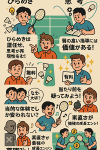 この日のオンライン教室は、前回の「バドミントンカースト」の話から発展し、成長の本質に迫るテーマから始まりました。多くのプレイヤーが陥りがちな「ひらめき」頼りのプレー。一見、スーパープレーを生み出す魔法のように思えますが、コーチはその危険性を指摘します。