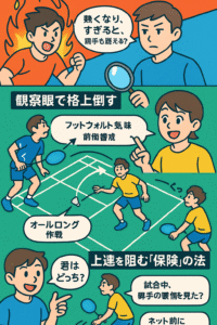 この「一歩前に踏み込む勇気」の差が、プレーのタイミング、打点、そして次の展開への準備の速さに直結します。甘い球をただ返すのではなく、次の攻撃の起点にする。その意識の差が、レベルの差として明確に現れていました。あなたのプレーは、無意識のうちに「保険」をかけていませんか?