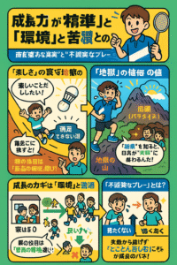 成長の鍵は「楽しさ」の追求ではなく、「地獄」を知る経験にある。地獄の基準値を持つことで、日常の練習や環境が「天国」であると気づけ、真の感謝と謙虚な学習姿勢が生まれる。