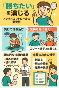 今日のメンタルや技術的な課題の土台として、コーチは昨日の教室で話した「5つのまとめ」を振り返りました。これらはバドミントンだけでなく、成長の根幹に関わる哲学です。