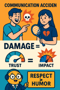 信頼関係(Trust)がゼロに近い初対面(t→0)の状態では、分母が限りなく小さくなるため、わずかな攻撃的ユーモアでも、相手へのダメージ(Impact)は無限大に発散してしまうのです。