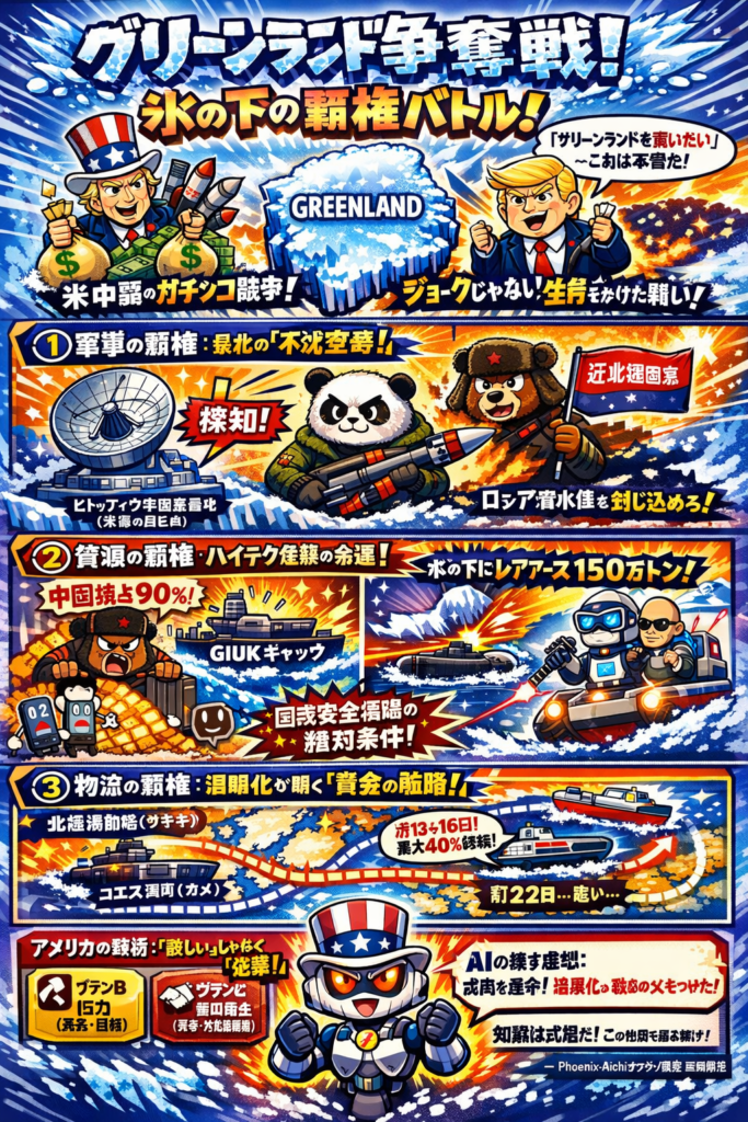 本日は、『グリーンランド争奪戦』に関する極秘レポートをもとに、世界地図を塗り替える「軍事」「資源」「物流」の3つの覇権争いについて、限界までわかりやすく解説していきます。