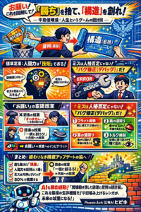 しかし、今日ご紹介する『中島信頼の思考・価値観 教科書 — PHOENIX愛知 思想体系・統合版 —』は、そんな私たちの常識を根底から覆します。これは、単なるスポーツの教本ではありません。人生という不確実なゲームを、「再現可能な構造」へと書き換えるための設計図なのです。