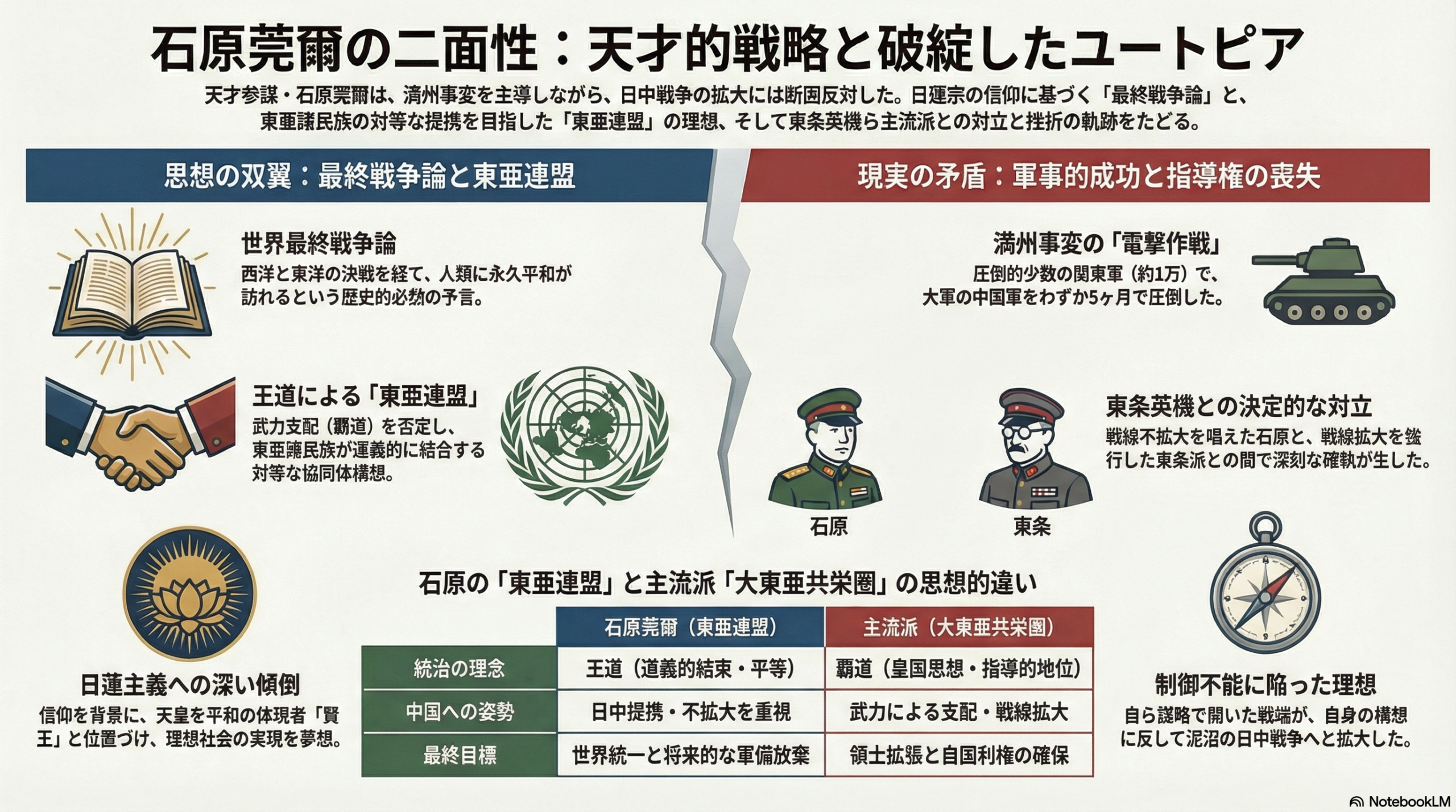海軍の山本五十六と並び称され、今なお熱狂的な人気を誇る陸軍の異端児。彼が提唱した恐るべき思想、そして引き起こした歴史的事件は、日本を、いや世界を根底から揺るがしました。本日は、この常識外れの天才の生涯と、彼が夢見た「途方もないスケールの未来」について、限界を超えたわかりやすさで、世界一熱く解説していきます!最後までついてきてください!