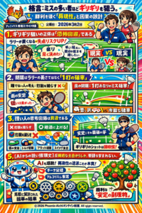 ラリーを恐れてはいけません。本当に恐れるべきは、意図を持たず、ただなんとなく打ってしまった「設計されていない1打」です。勝利は決して、焦って早く終わらせようとする「早さ」から生まれるものではありません。勝利は、因果を理解し、状態を整え、確固たる基礎を築き上げた者だけが得られる「安定の副産物」なのです。