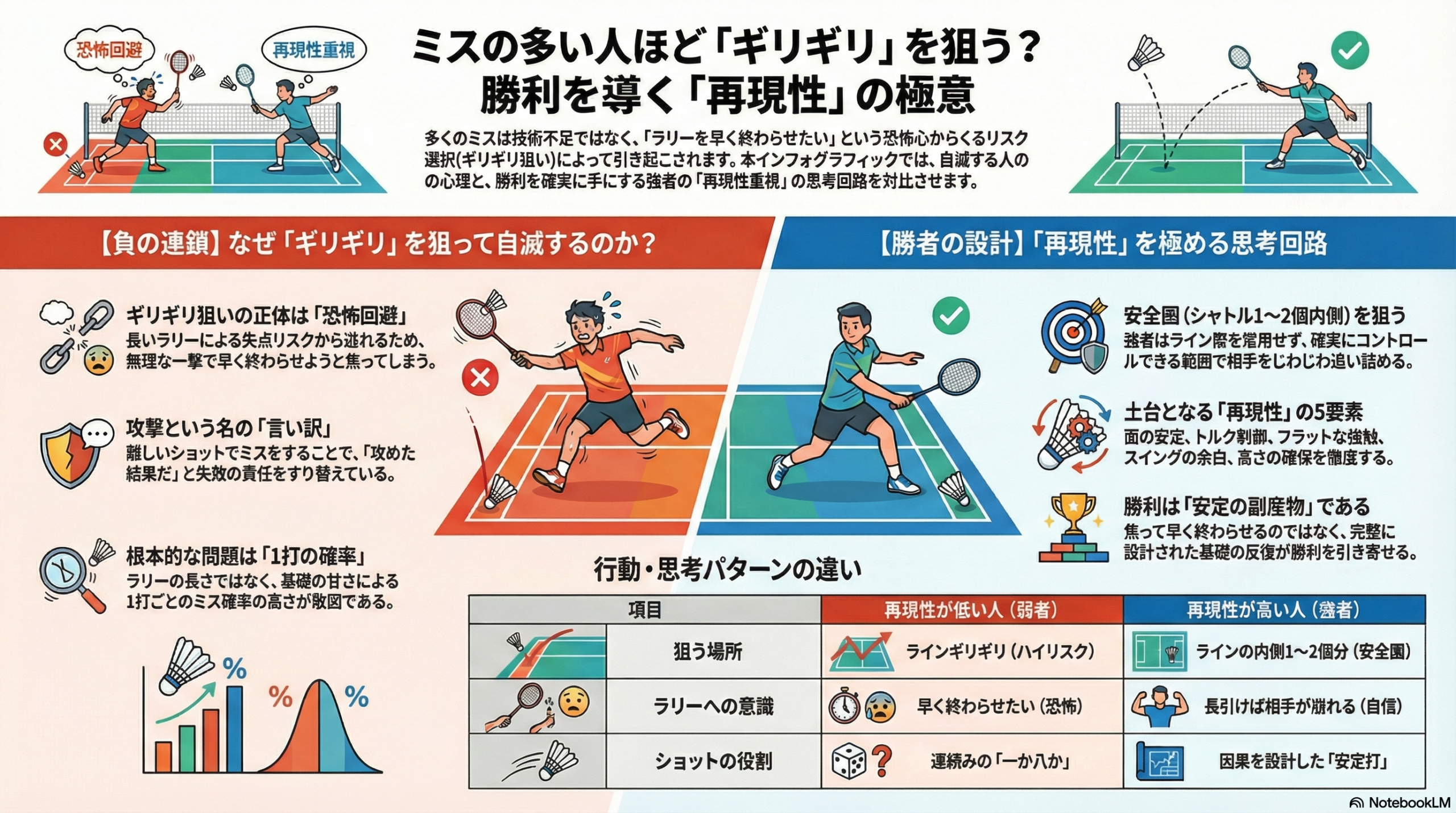 ラリーが長くなるほど失点リスクが高まるというのは事実です。しかし、再現性が低い選手は「打数が増える=自分が自滅する確率が上がる」と無意識に計算してしまいます。その結果、「長引けば負けるから、早く決めよう」と焦り、ライン際という最もリスクの高い場所を狙って自滅していくのです。