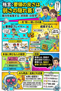 これらは真理を突いた見事な言葉です。失敗を恐れて小さくまとまるのではなく、あえて「非効率」な泥臭い道を選び、自らの枠を押し広げようとするすべての人を、私は全力で応援します。目先の1点よりも、揺るぎない土台を作り上げるその過程こそが、真の強さへの最短ルートなのです。読者の皆様、ぜひ今日の練習から「ミスを恐れない増築工事」を楽しんでください!