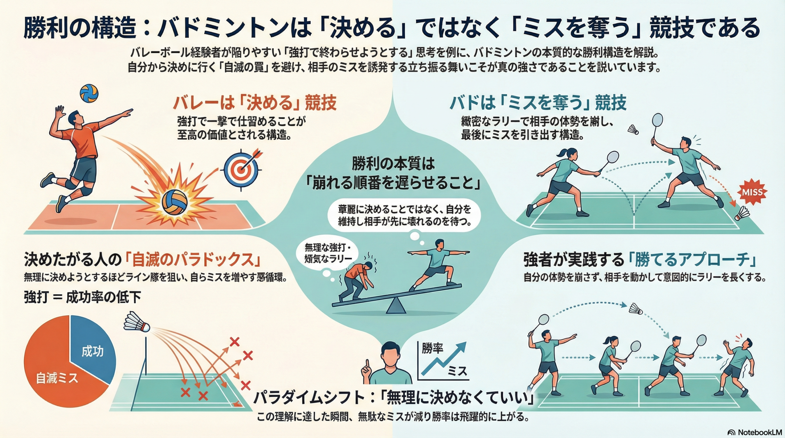 バドミントンを指導していると、ある特徴にすぐ気づかされます。それは、「バレーボール経験者は、とにかく“決めたがる”」ということです。