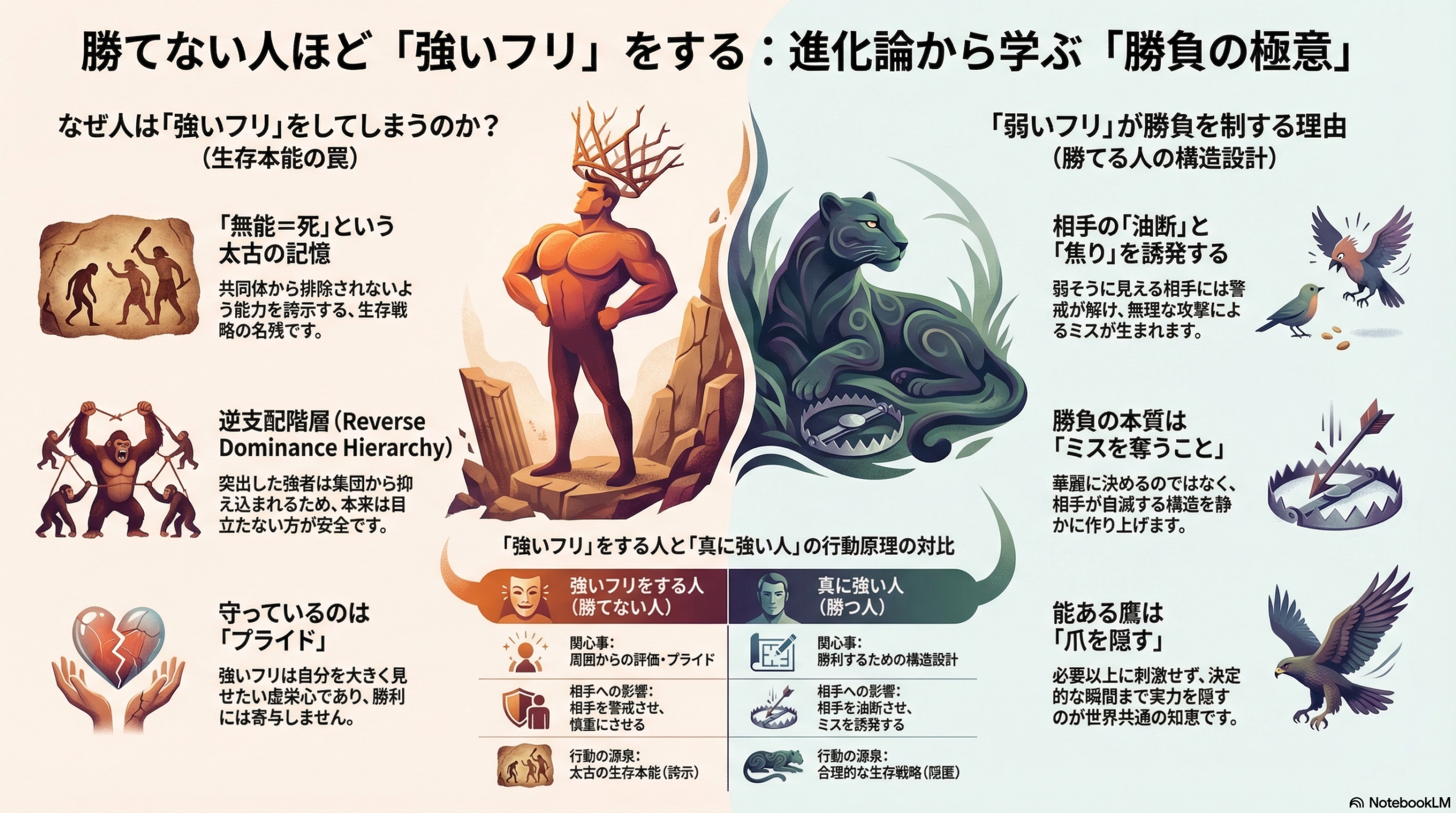 これまでの内容を整理しましょう。「強いフリ」は、自分を守ろうとする太古の生存本能から生じる行動ですが、実際の勝負の場では逆効果になります。なぜなら、彼らが守っているのは「強く見られるというプライド」に過ぎないからです。