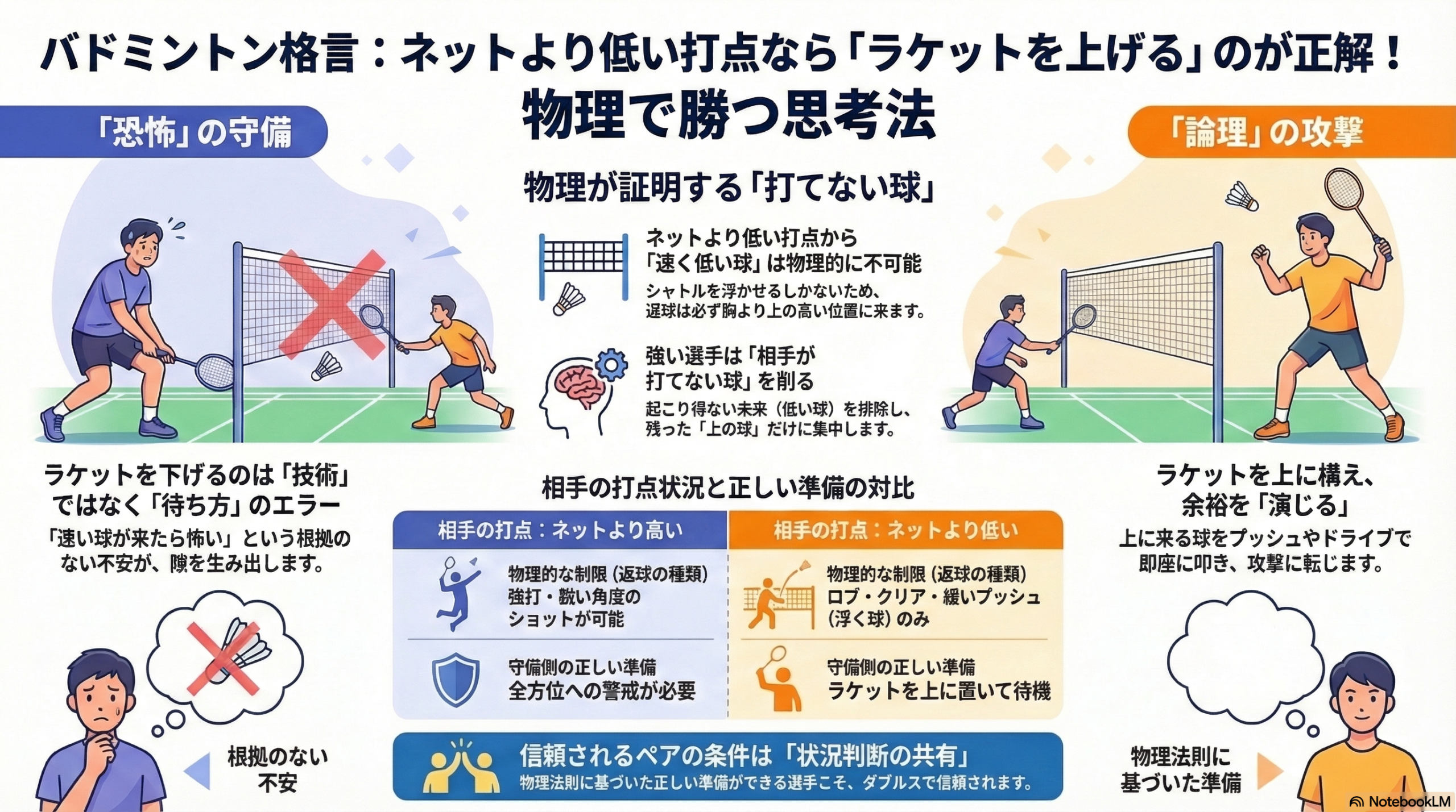 だからこそ、彼らの守備はシンプルになります。ただラケットを上に置くだけ。バドミントンは反射神経を競うスポーツではなく、論理的に「可能性を削る」スポーツなのです。
