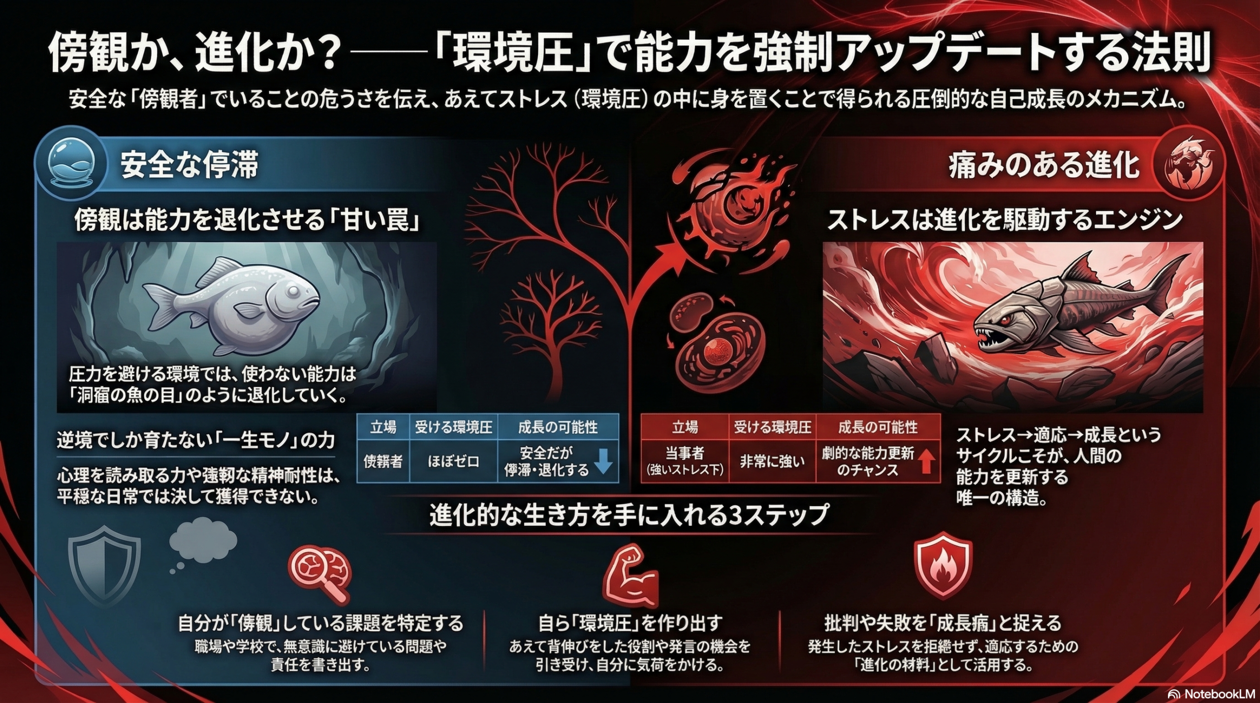 格言:傍観という「安全な停滞」を捨てよ!環境圧と痛みから始まる圧倒的成長の法則