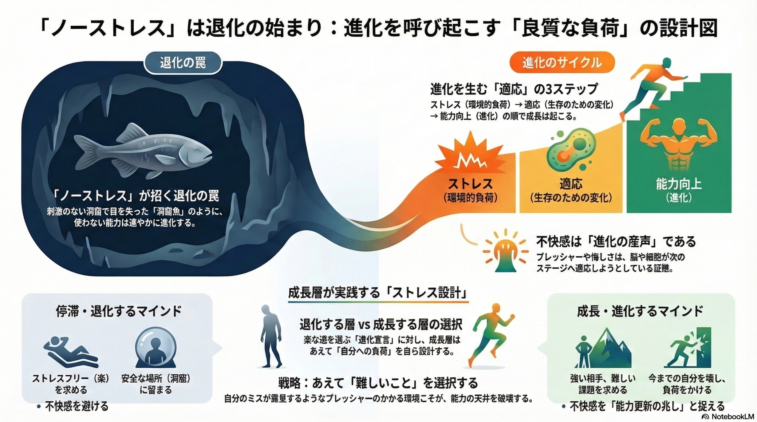 人間もまた生物であり、この構造から逃れることはできません。ストレスがなくなれば、思考しなくなり、工夫しなくなり、適応しなくなります。能力が更新されない状態、それこそが「退化」なのです。