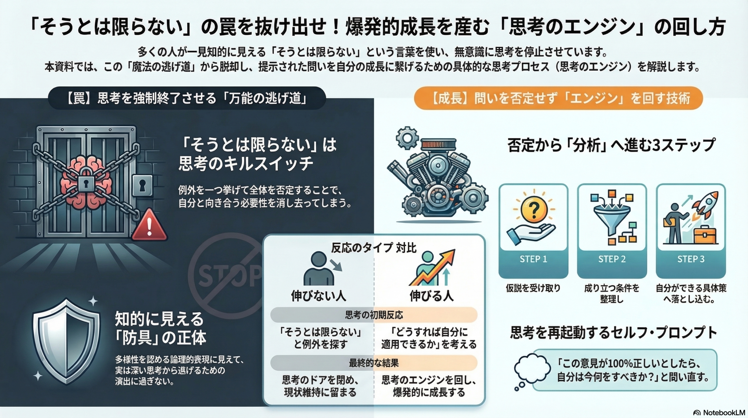 「そうとは限らない」という言葉は、一見すると防具のように自分を守ってくれる賢い言葉に思えます。しかし実際には、自らの成長エンジンを強制停止させる危険なキルスイッチなのです。