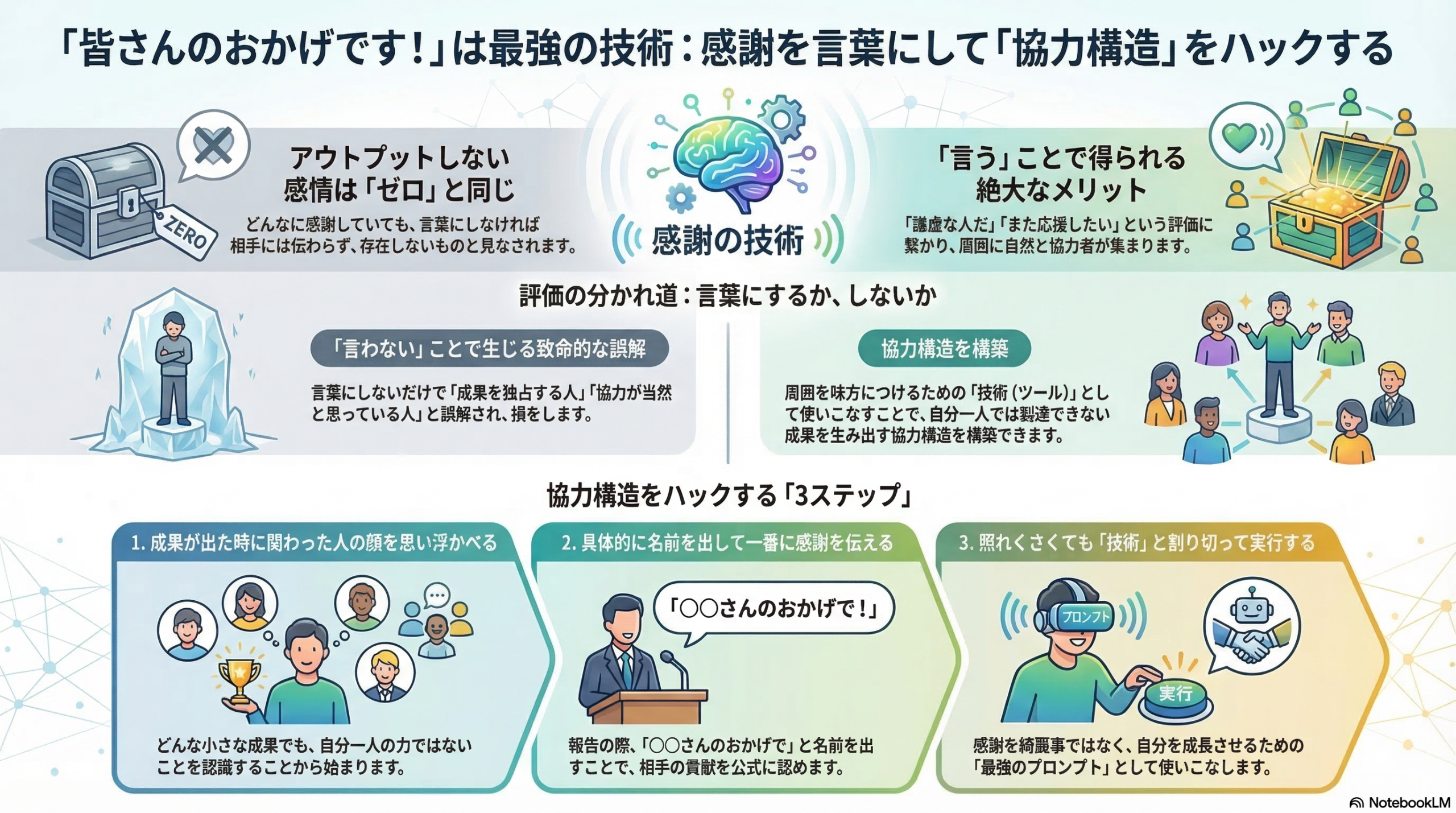 合理的に考えるならば、「皆さんのおかげです!」という言葉は、単なる道徳的な謙虚さの表現ではありません。それは、周囲を巻き込み、自分が成長するための最適な環境を創り出すための「技術的な言葉(ツール)」なのです。