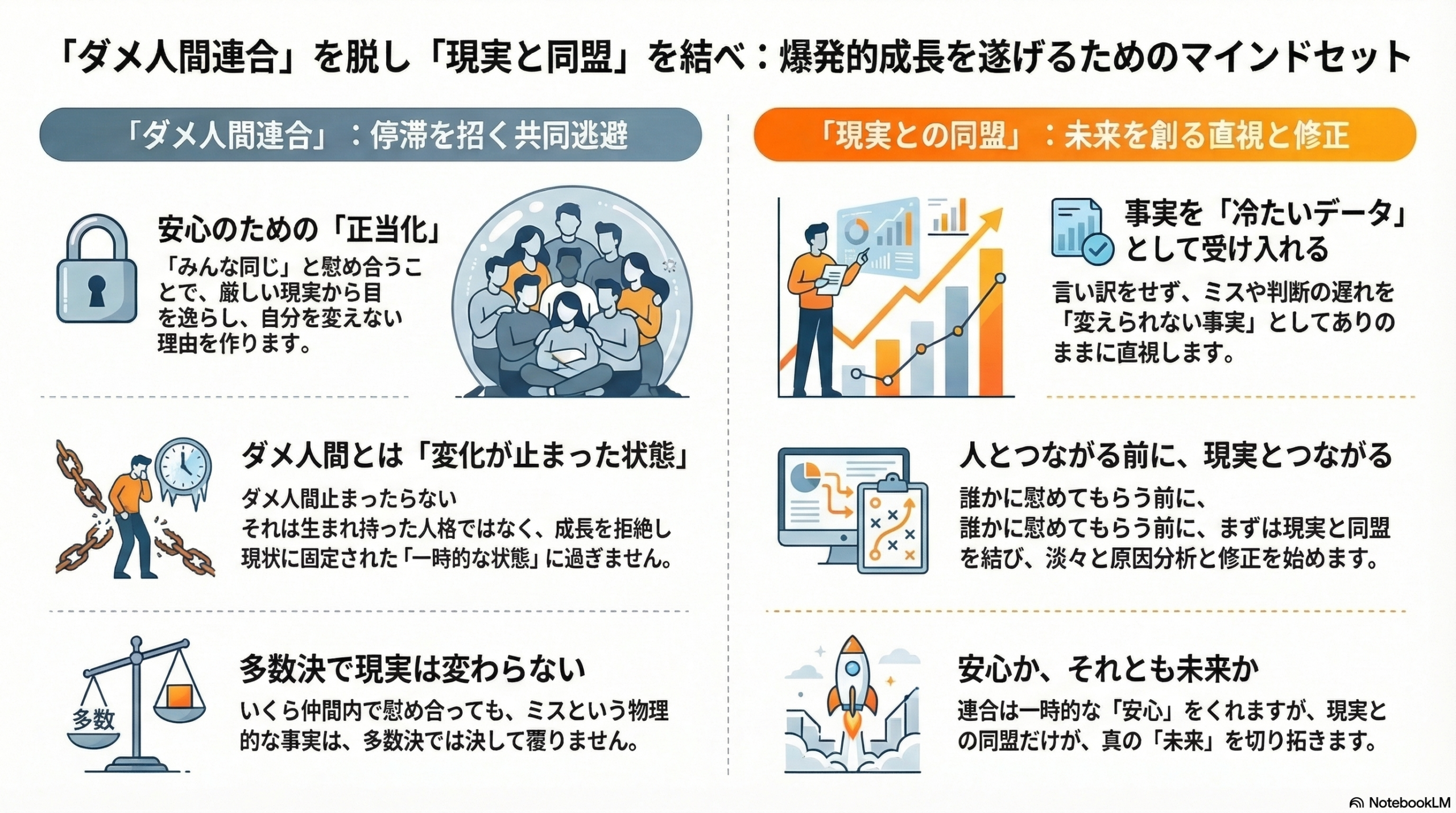 ダメ人間連合は、あなたに一時的な「安心」はくれますが、決して「未来」はくれません。真の安心感や自己肯定感というものは、厳しい現実を直視し、一つひとつ課題をクリアした者にだけ訪れる副産物だからです。