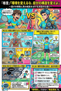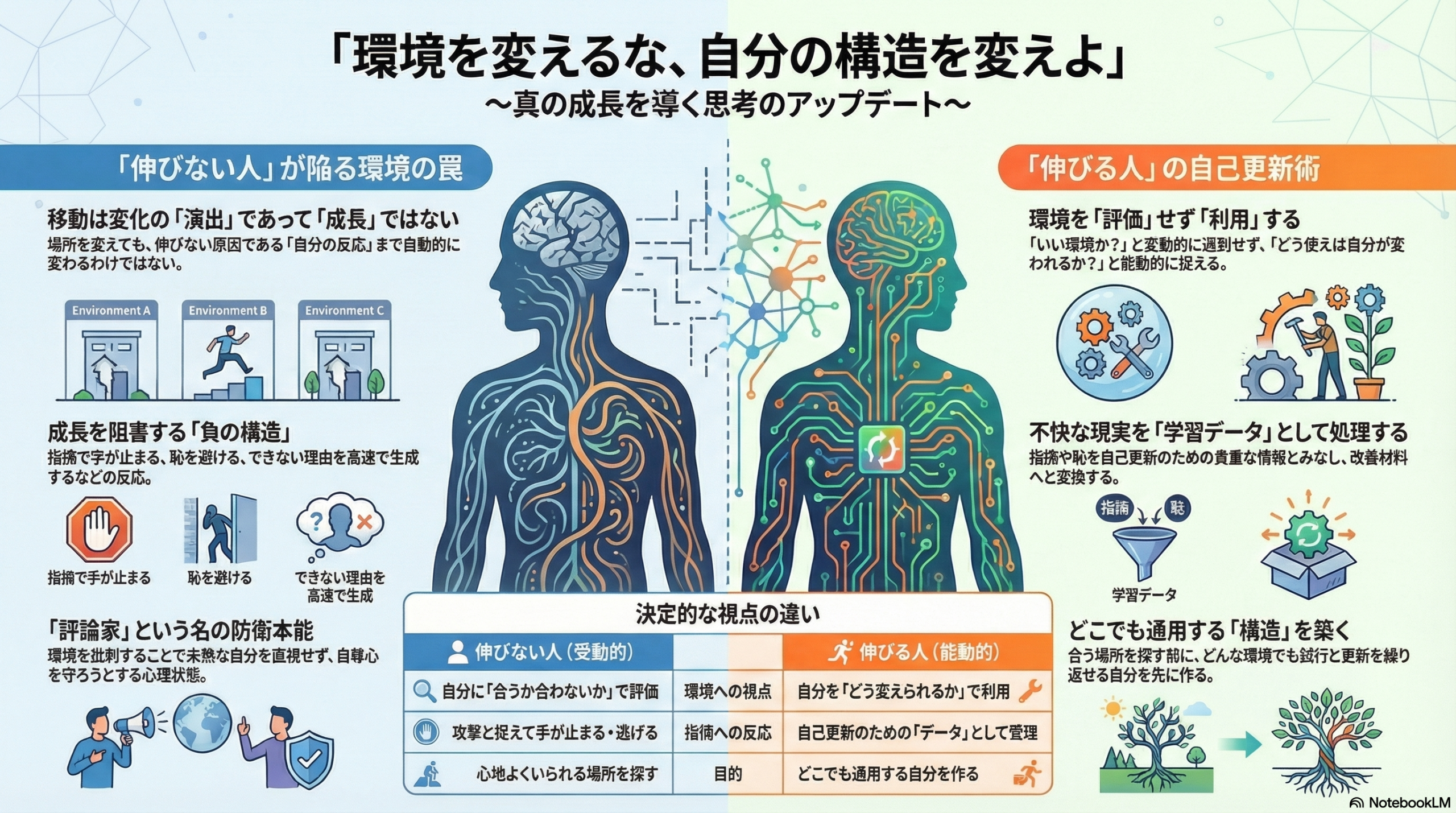 しかし、「理不尽な環境から離れること」と「自分が伸びない理由は全部環境のせいだと思い込むこと」は全くの別問題です。ここを混同すると、一生ズレたままになります。