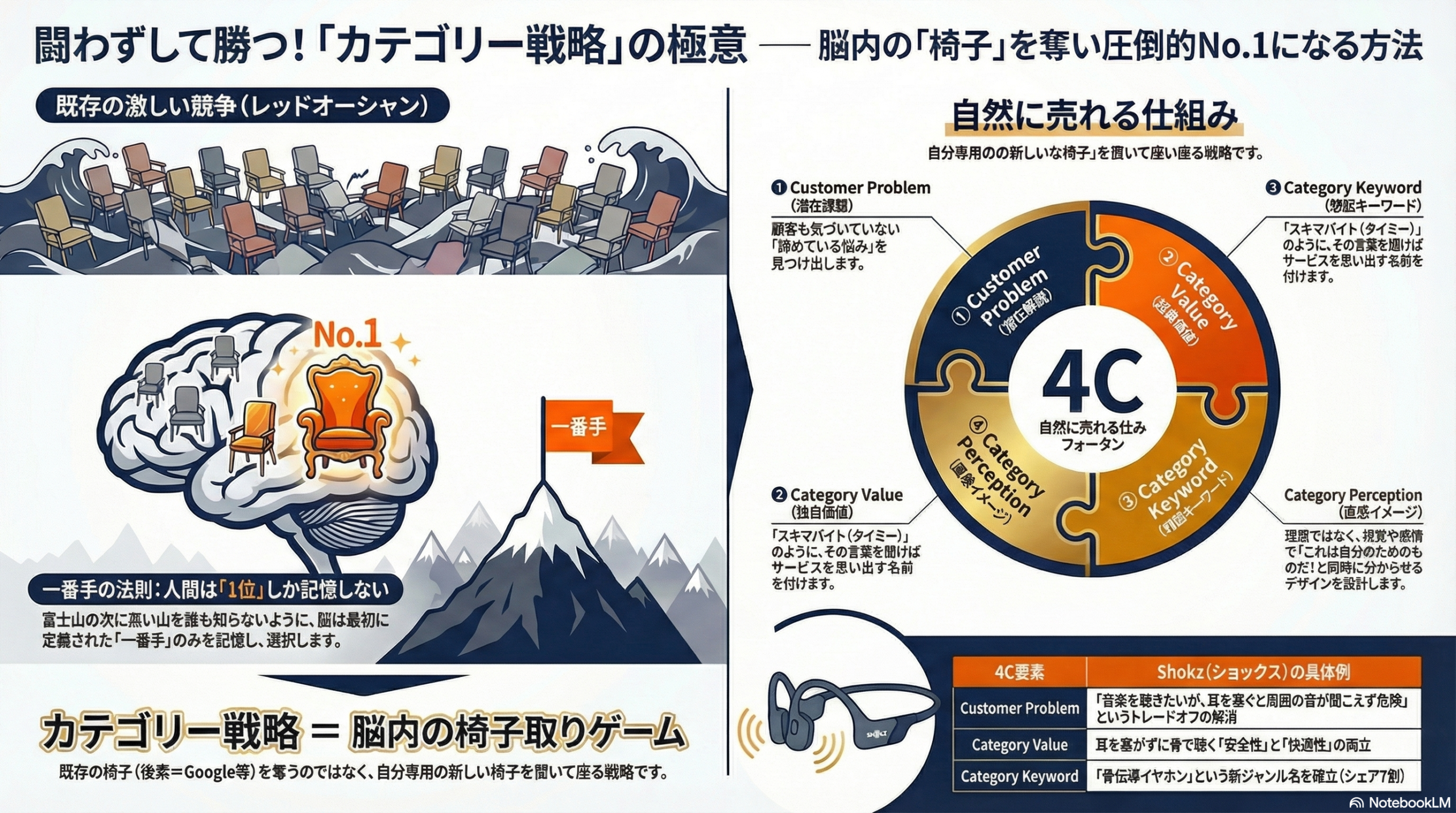 結果として、Shokzは「イヤホン」というレッドオーシャン(血みどろの激戦区)でAppleやSonyと戦うことを避け、「骨伝導イヤホン」という全く新しい海を作り出し、そこで圧倒的なNo.1(シェア7割)の地位を築いたのです。