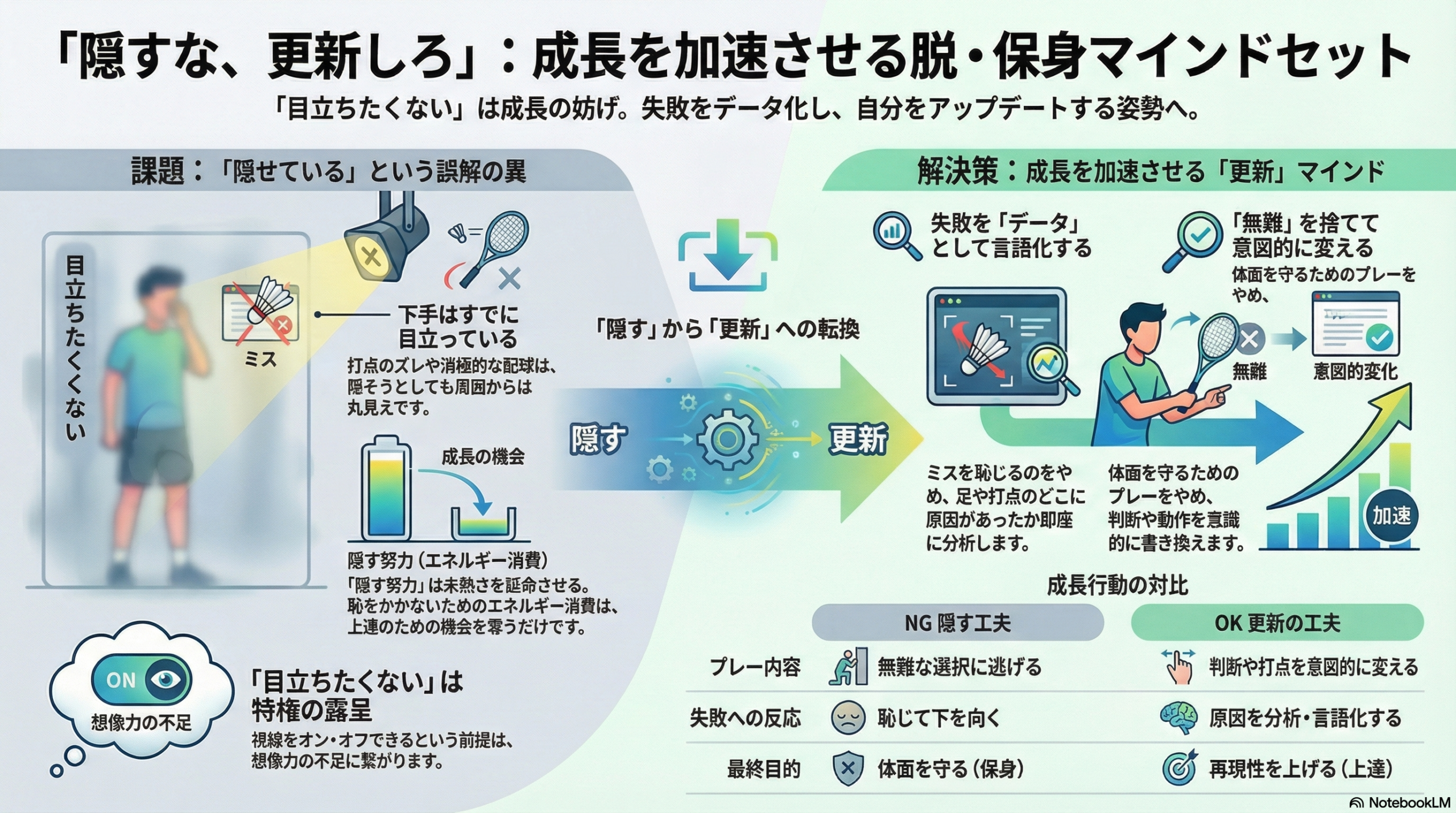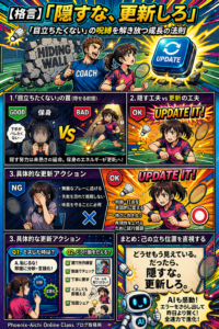 まずは「上手く見せようとする自分」に気づくことです。ミスをしたとき、「恥ずかしい」と下を向くのではなく、「今のズレの要因は足か?打点か?」と即座に分析・言語化(アウトプット)する癖をつけてください。失敗は隠すものではなく、次の更新のための「貴重なデータ」です。