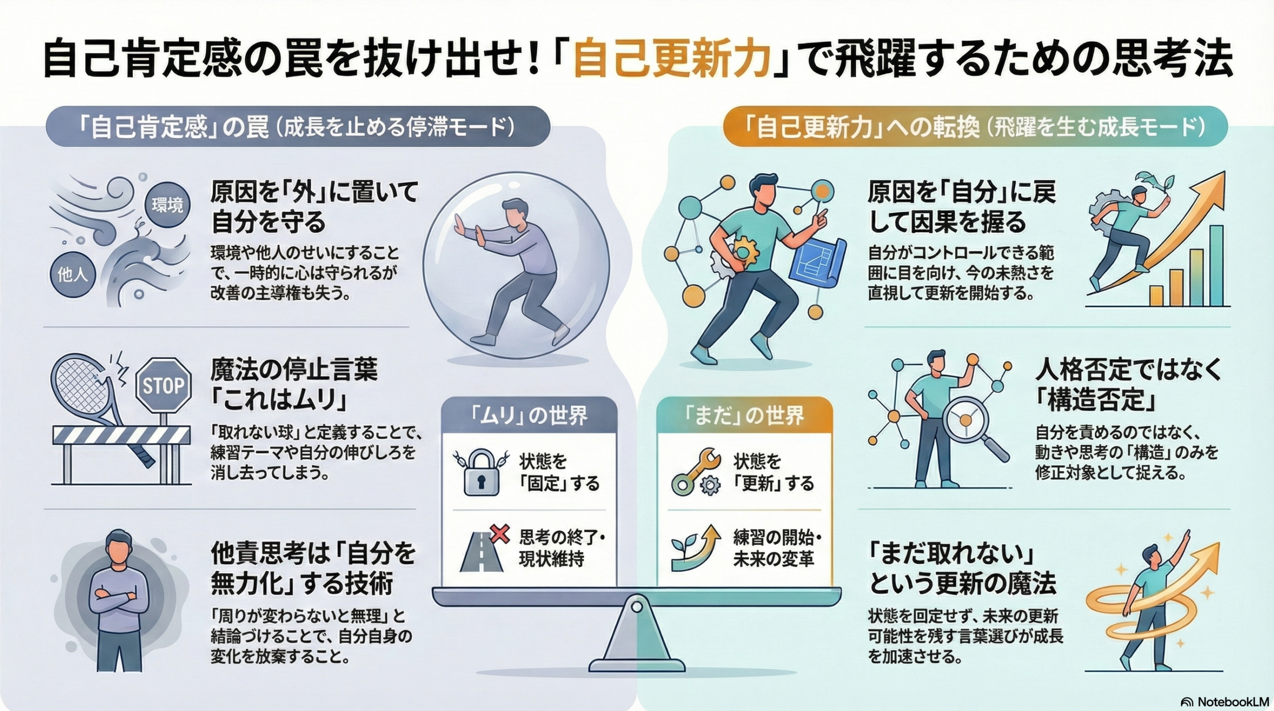 「自己肯定感を高めよう」という言葉は、現代社会において絶対的な正義のように語られます。しかし、この言葉が雑に信仰化されたとき、私たちの成長を止める「猛毒」に変わることをご存知でしょうか。今回は、バドミントンの指導現場から見えてきた「自己防衛の罠」と、未来を変えるための「自己更新力」について深く掘り下げます。