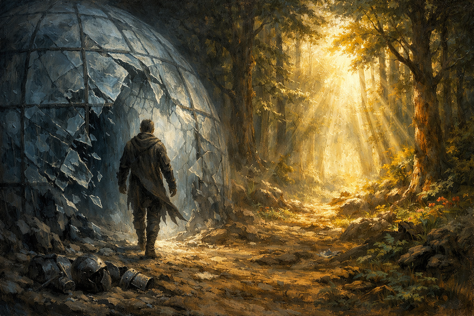 朝日が差し込む深い森―古い殻を破り、新たな可能性へと向かう自己更新の象徴