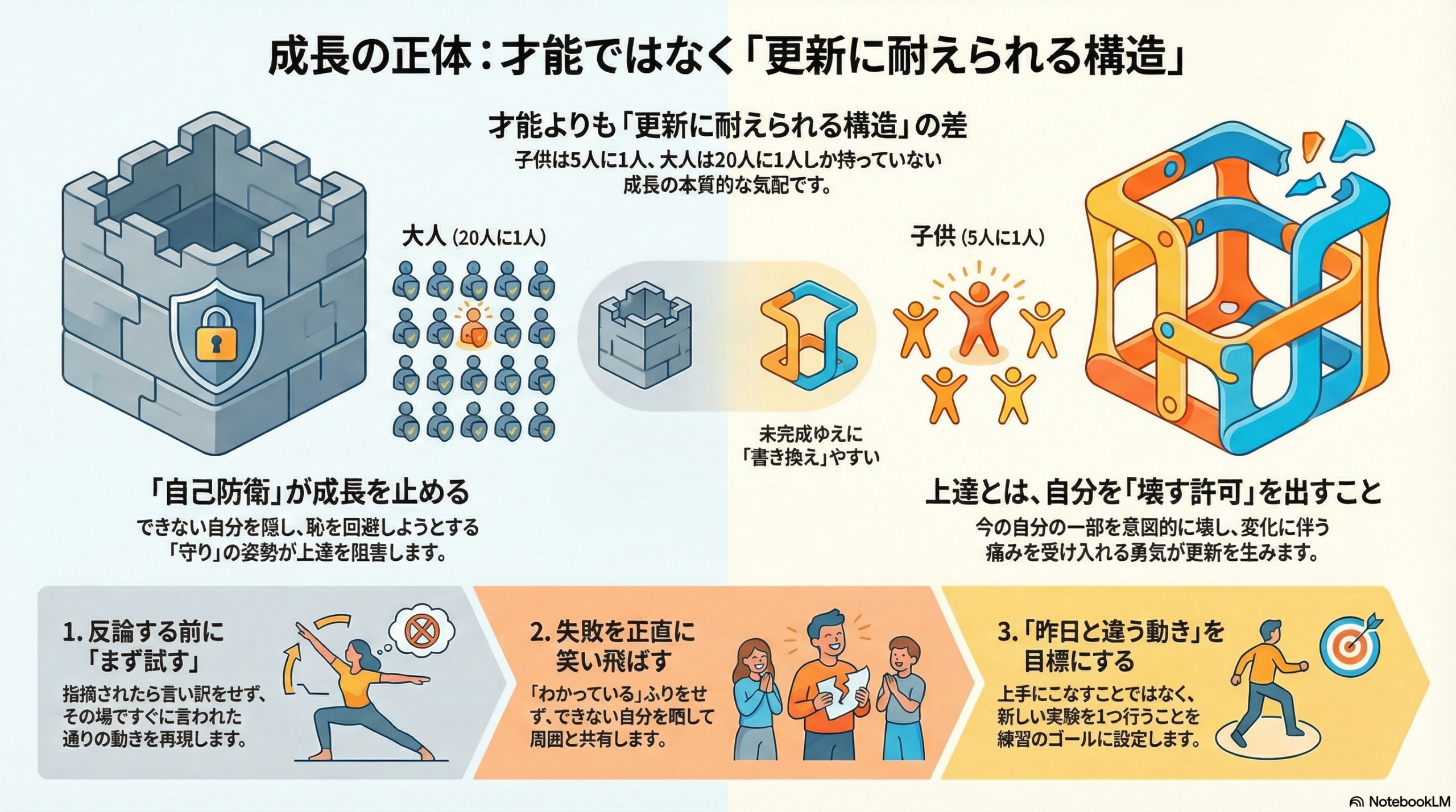 伸びる人とは、単に根性がある人でも、ポジティブな人でも、生まれつきの才能がある人でもありません。「壊れる許可を自分に出せる人」なのです。子供はこの許可を出しやすいからこそ成長の可能性を感じさせます。大人は極端にその許可が出せないため、成長の壁にぶつかります。