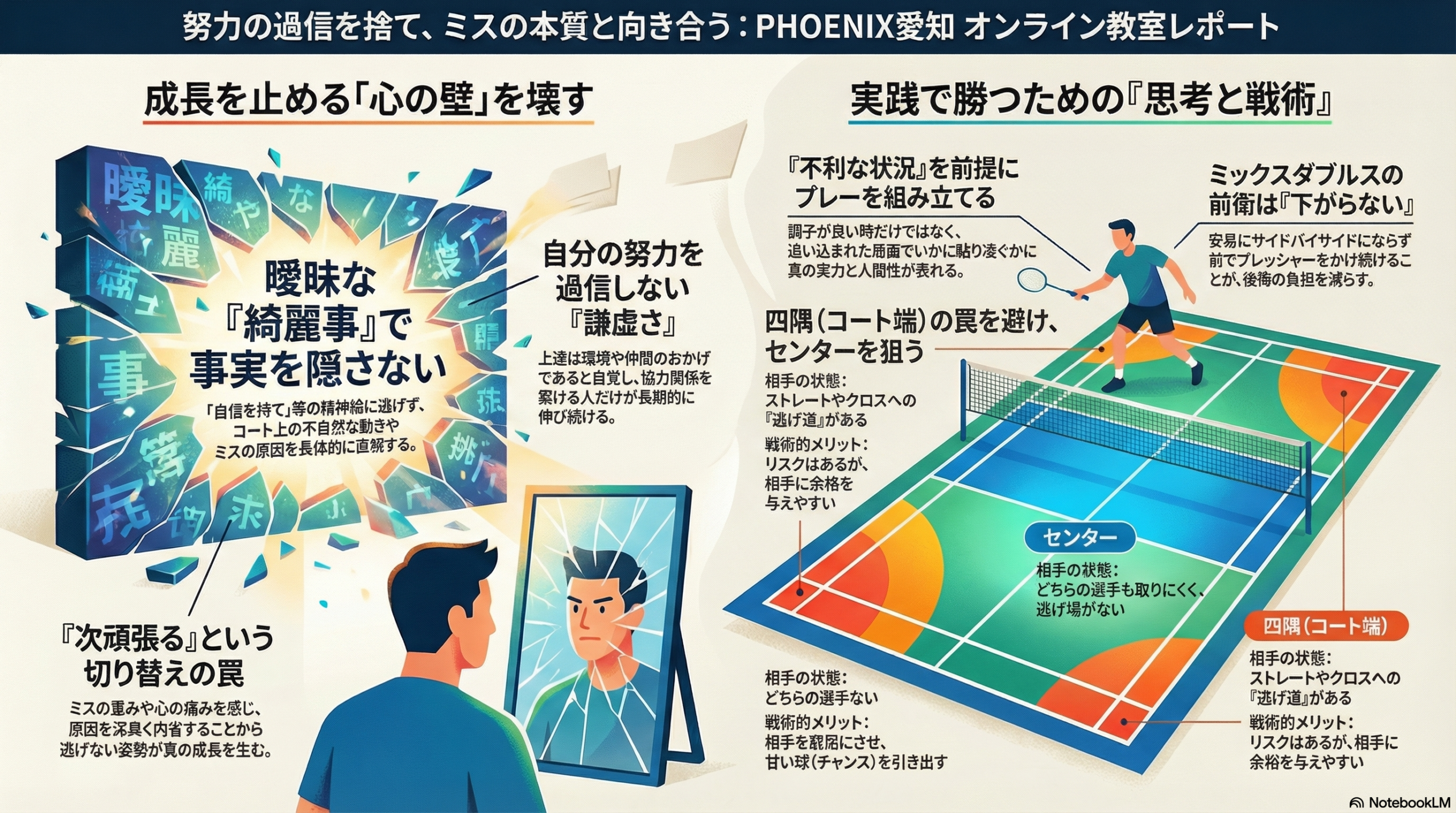 「やっちまった」という心の痛みを感じ、なぜミスをしたのか、構えが悪かったのか、配球を間違えたのかを深く内省する。その地道で泥臭い作業から逃げない人だけが、真にミスを減らし、上のステージへと登っていけるのです。今日の学びを胸に、コートでの自分自身の「不自然さ」と真っ直ぐに向き合っていきましょう!