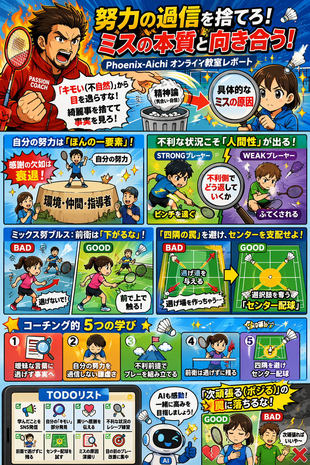 「やっちまった」という心の痛みを感じ、なぜミスをしたのか、構えが悪かったのか、配球を間違えたのかを深く内省する。その地道で泥臭い作業から逃げない人だけが、真にミスを減らし、上のステージへと登っていけるのです。今日の学びを胸に、コートでの自分自身の「不自然さ」と真っ直ぐに向き合っていきましょう!