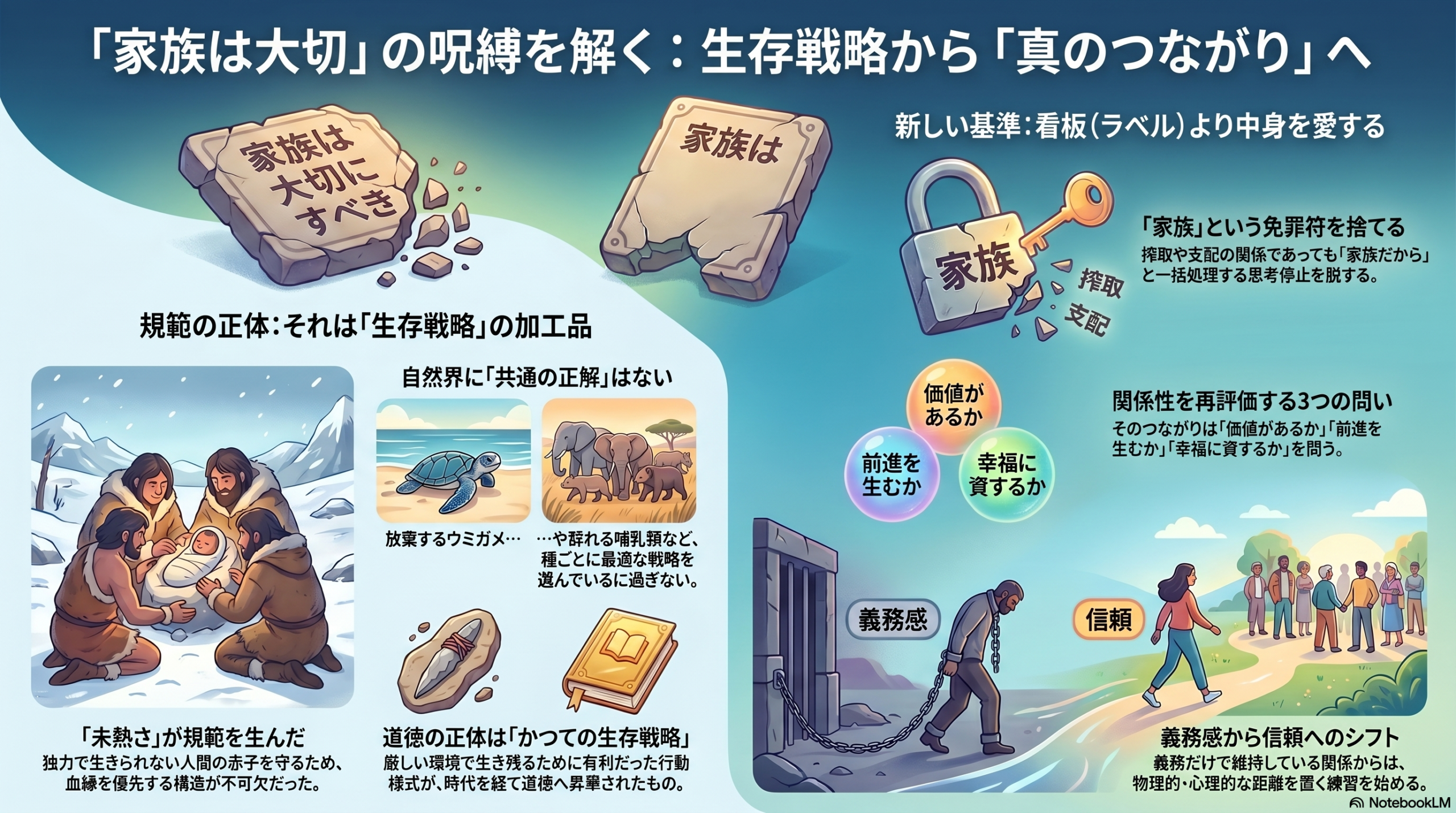注意すべきは、「家族が大切だったから規範が生まれた」のであり、「規範があるから家族は常に大切」ではないという事実です。この順序を逆にしてしまうと、思考は完全に停止します。