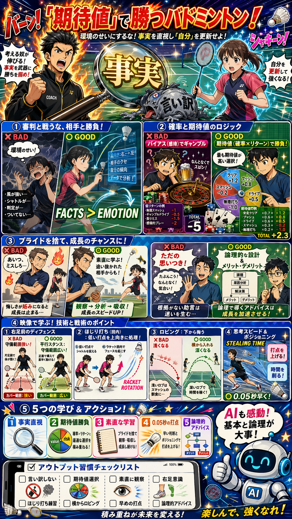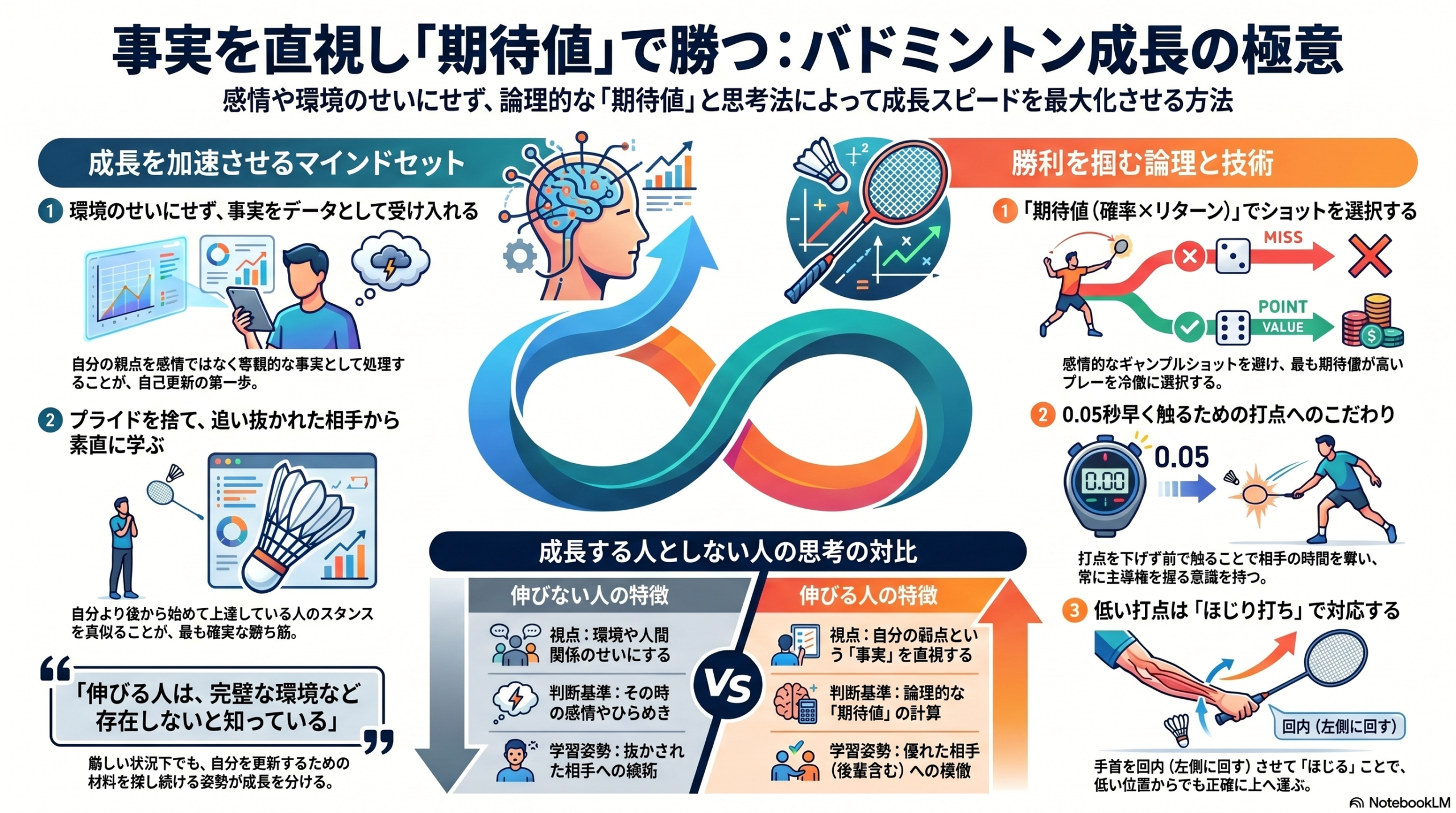 感情ではなく論理的な設計で動く。 環境のせいにせず、自分の弱点という事実を直視すること。バドミントンで伸びる人は、全方位的に自分を伸ばす方法を知っている。