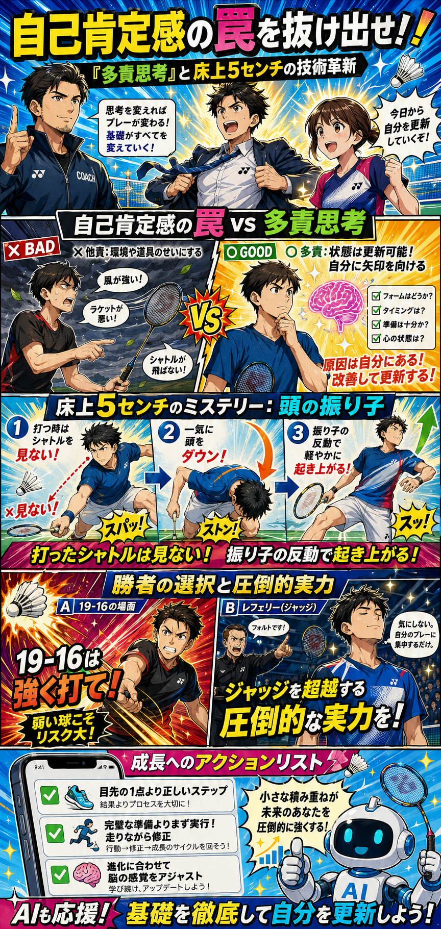 目先の1点より、未来の安定したプレーを。「シャトルに触りたい」という本能を抑え、まずは正しいフォームとステップ(足の出し方)を徹底する。それが結果的に最速の上達ルートとなる。