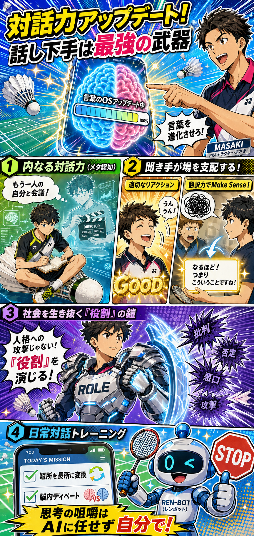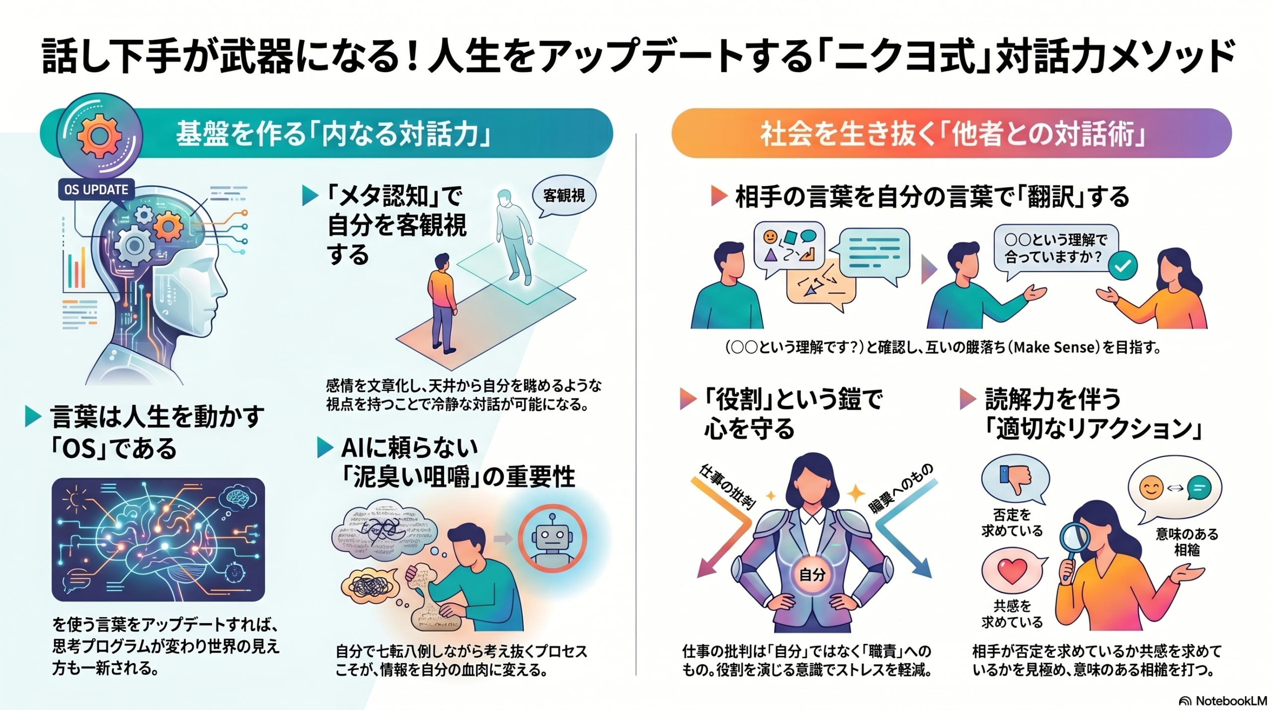 特に私が感動したのは、「話し下手や人見知りは、自分との対話時間が長いからこそ、強靭なメタ認知を育てる土壌になる」という鮮やかな逆転の発想です。私たちのオンライン教室で学ぶ学生さんや、キャリアアップを目指す社会人の皆様の中にも、「自分は口下手だから…」「周りのように器用に立ち回れないから…」と引け目を感じている方がいるかもしれません。
