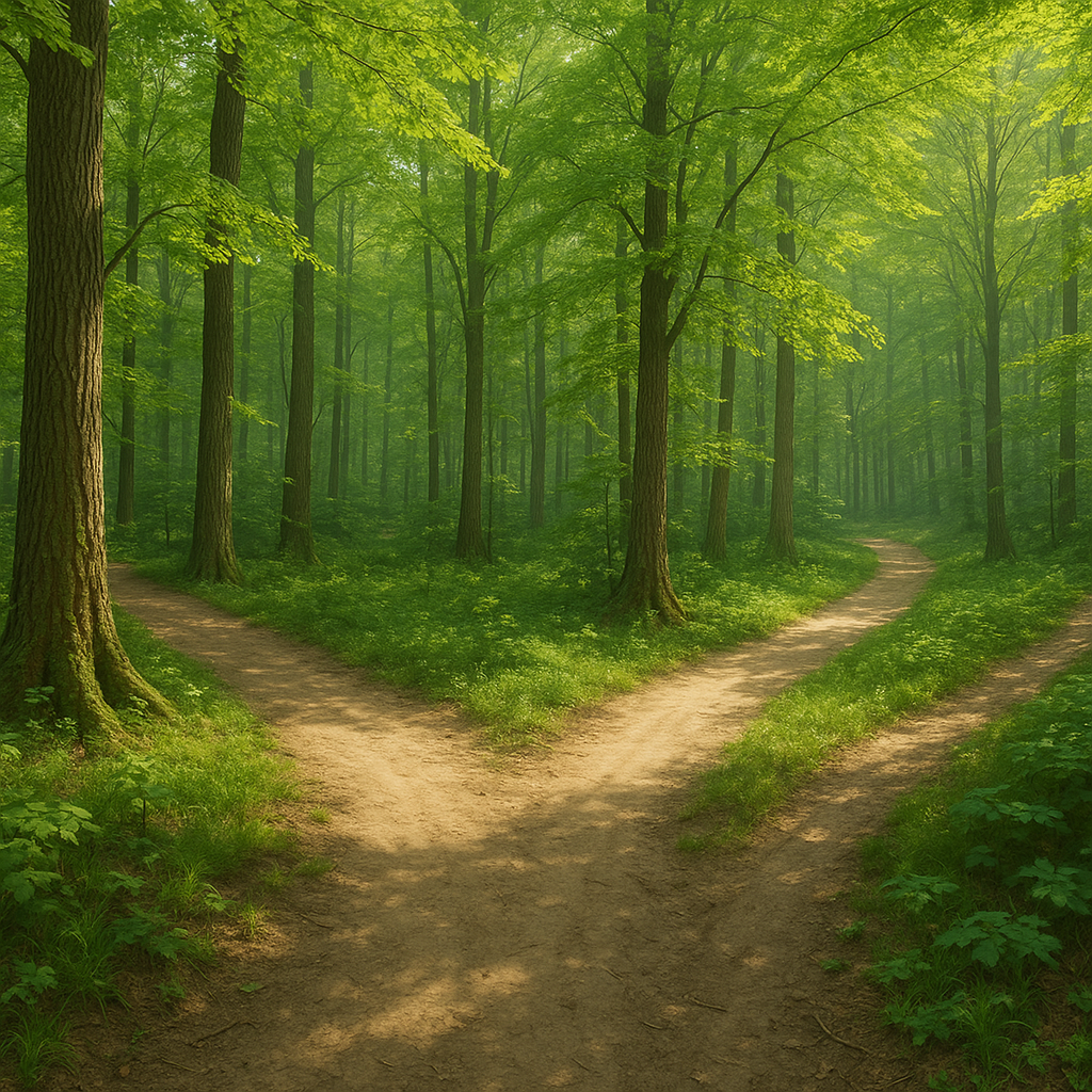 森の中に伸びる二つの道―選択と新たな挑戦の始まりを象徴する風景