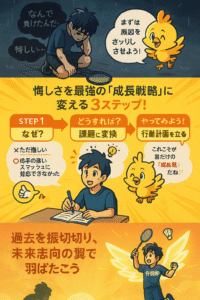 「悔しい!」という感情は、成長のきっかけを与えてくれる貴重なシグナルです。しかし、そのシグナルを受け取った後、いつまでも過去の敗北を眺めていてはいけません。