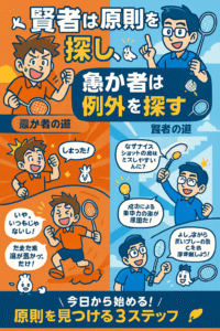 - 賢者の思考:「なぜナイスショットの後にミスが増えるのか?」と考えます。そして「大きな成功による一時的な安堵や集中力の低下が原因だ」という原則にたどり着きます。