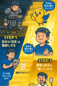 「信念を捨てる」と言っても、ただ空っぽになれというわけではありません。これは「ありたい自分」というゴールに向かうための積極的な戦略です。以下の3ステップで実践してみましょう。